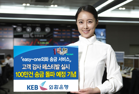 ‘이지-원 외화송금서비스’는 송금전용계좌에 송금대금을 원화로 입금하면 자동으로 해외송금되는 쉽고 편리한 외환은행의 대표적인 해외송금서비스다. 행사 기간중 100만건 송금을 돌파할 예정이며 2007년 11월 특허 등록된 상품이다.