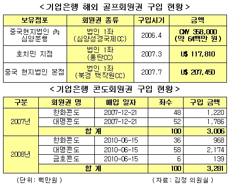 또 기업은행이 보유하고 있는 골프회원권은 전국에 걸쳐 16좌에 달하는것으로 파악됐다. 지난 2006년 레이크우드(3억 9,700만원), 제일(6억 1,600만원) 등 11좌를 106억 2,200만원에, 2007년에는 레이크우드(5억 7,500만원)등 5좌를 31억 3,700만원에 매입해 총 16좌의 골프회원권을 137억 5,900만원에 매입한 것으로 드러났다.