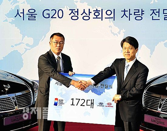 현대·기아자동차는 서울 삼성동 코엑스 동문광장에서 이시형 G20 준비위원회 행사기획단장 및 정의선 현대자동차 부회장 등이 참석한 가운데, G20 서울 정상회의에서 이용할 차량에 대한 전달식을 가졌다고 밝혔다.