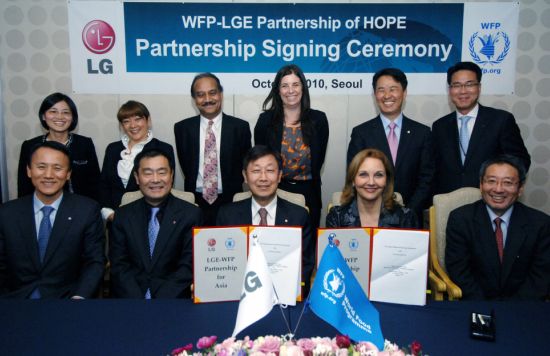 최근 여의도 LG트윈타워에서 WFP 조셋 시런 사무총장과 LG전자 아시아지역본부장 남영우 사장, 김영기 부사장 등 20여 명이 참석한 가운데 양해각서 체결식이 열렸으며, 이번 협약에 따라 내년부터 캄보디아와 방글라데시에 ‘LG희망가족’ 1만2천 가구를 선정하고 이들과 함께 마을 인프라 구축 사업을 시작한다.