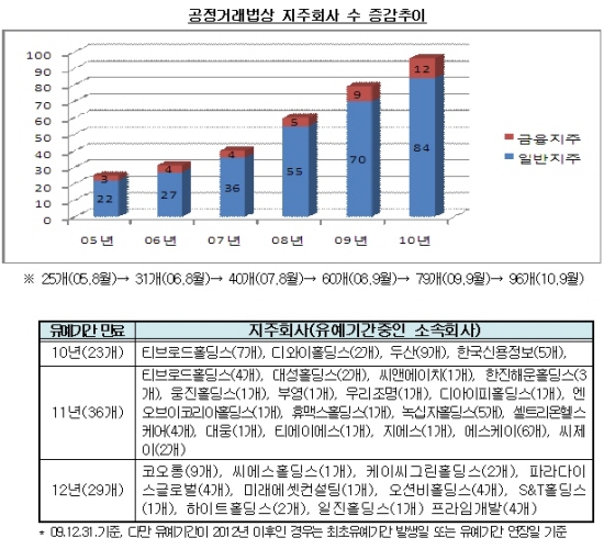 각각 부채비율 200%미만, 일반지주회사의 금융사보유금지, 비계열사 지분소유 제한, 자·손자·증손회사 지분율 규제 등을 받는 회사를 말한다. 이 중 올해(10년) 유예기간이 만료되는 회사는 23개사이며, 36개사는 11년도에, 29개사는 12년도에 유예기간이 만료된다.