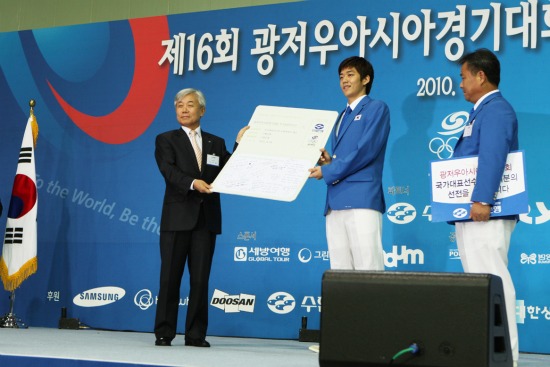 이날 전달된 응원메시지는 지난 4일 명동에서 국민들이 직접 작성한 것으로 이주형 수협행장이 직접 결단식에서 선수단 대표 이용대 선수(베이징올림픽 배드민턴 금메달)에게 전달했다.