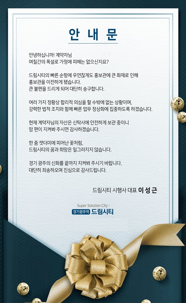 드림하우징 이성근 대표는 "화재로 인해 경기광주역 드림시티 홍보관은 고객들의 불편을 최소화하기 위해 즉각적으로 임시 홍보관을 마련하여 운영을 시작할 준비를 마쳤다"며 "새로운 홍보관은 입주 희망자들에게 기존과 동일한 정보를 제공하며, 보다 안전하고 편리한 환경에서 서비스를 이어갈 예정”이라 밝혔다.
