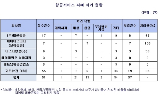 소비자원 관계자는 "항공서비스 이용 도중 발생한 피해사례가 가장 많이 접수됐던 업체는 대한항공으로, 총 17건의 사례가 접수됐고 그중 8건이 처리돼 47%의 처리율을 보였다"며 "7건의 사례가 접수된 보람항공의 경우는 접수된 모든 피해사례가 성공적으로 처리돼 100%의 처리율을 보였다. 이스타항공의 경우에는 50%의 처리율을 나타냈다.
