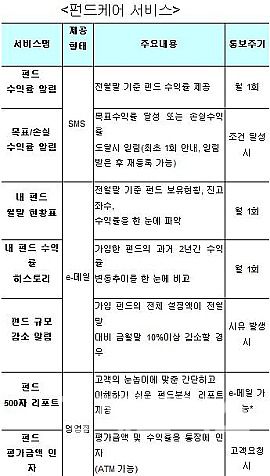 e메일로는 전월말 기준 펀드 보유현황, 잔고좌수, 수익률을 한 눈에 파악하는 '내 펀드 월말 현황표', 가입한 펀드의 과거 2년간 수익률 변동추이를 보여주는 '내 펀드 수익률 히스토리', 가입한 펀드의 전체 설정액이 전월말 대비 금월말 10%이상 감소할 경우 이를 안내하는 '펀드 규모 감소 알림', 을 보내준다.
