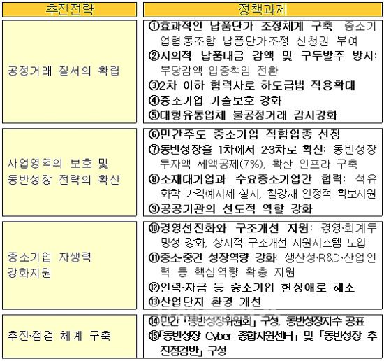 정부는 이번 대책에서 ▲ 공정거래 질서의 확립 ▲ 중소기업 사업영역의 보호 및 동반성장 전략의 확산 ▲ 중소기업의 자생력 강화 지원 ▲ 지속적인 추진․점검 체계 구축 등 4대전략, 15개 정책과제를 제시하고 차질 없이 추진해 나가기로 했다.